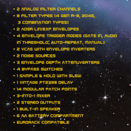 Meet Beauty & the Beast of all filters, the Beauty is our smooth discrete analog recreation of a 2045 (24 dB/oct) LP filter, and the Beast is our proprietary analog GEN R-8 (12 dB/oct) filter that can snarl and howl in all modes (LP, BP, HP, NOTCH). We then decided to combine the 2045 Lowpass filter with the Highpass of the GEN R-8 to create three additional filter types, a Bandpass (BP+), a phaser-like Band Reject (BR+) and a very wide Notch filter (NOTCH+), for some truly unique filter sounds.