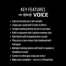 Meet the Stylophone VOICE, the latest edition to our Pocket Range Series. Record sounds using the Stylophone VOICE from the world around you and then bend the audio with multiple effects and turn it into music.  It’s really simple to capture and play your own samples using three different voices, which you can then shape with 12 built-in effects. Create quick melodies and wild sound experiments. The VOICE makes creating music fast, fun, and completely hands-on.